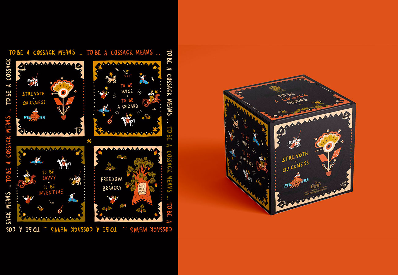 Nous retenons également le projet de Julia Cherednichenko intitulé « To Be A Cossack Means. » Inscrite dans la catégorie packaging, Cherednichenko nous offre en effet un visuel particulièrement rafraîchissant ! Dans un style naturel presque enfantin, elle livre une oeuvre qui semble raconter une histoire.