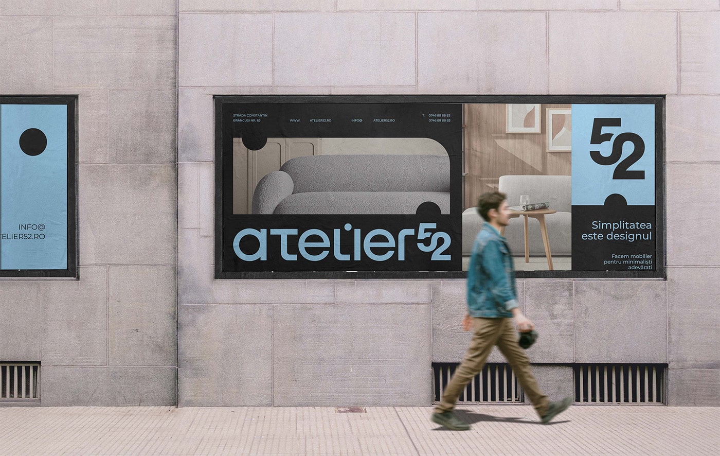 Afin de doter Atelier 52 d’une identité visuelle harmonieuse, Fabbulla a créé une typographie personnalisée pour le logo. Il a en effet astucieusement marié les chiffres cinq et deux, créant ainsi un symbole qui devient la pierre angulaire de l’identité de la marque. Ce choix de conception améliore non seulement la reconnaissance de la marque, mais ajoute également une couche de sophistication. L’interaction entre les chiffres est subtile mais suffisamment percutante pour être prégnante.